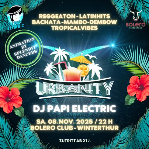 "Today's best Latin Music" heisst es, wenn DJ Papi Electric am 08. Nov. 2025 ab 22 H im Bolero Club an der URBANITY performt. Der unverwechselbare Mix aus Reggaeton, Latinhits, Dembow & Tropicalbeats, wie Bachata odr Bailefunk zaubert Südamerikanische Partyvibes ins Bolero. Da...