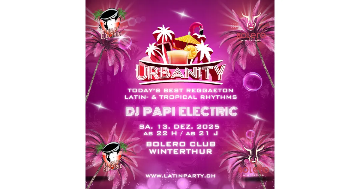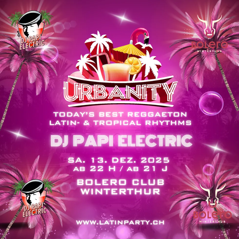 „Today’s Best Latin Music“ heißt es am 13. Dez. 2025 ab 22:00 Uhr, wenn DJ Papi Electric im Bolero Club an der URBANITY die Tanzfläche zum Beben bringt.