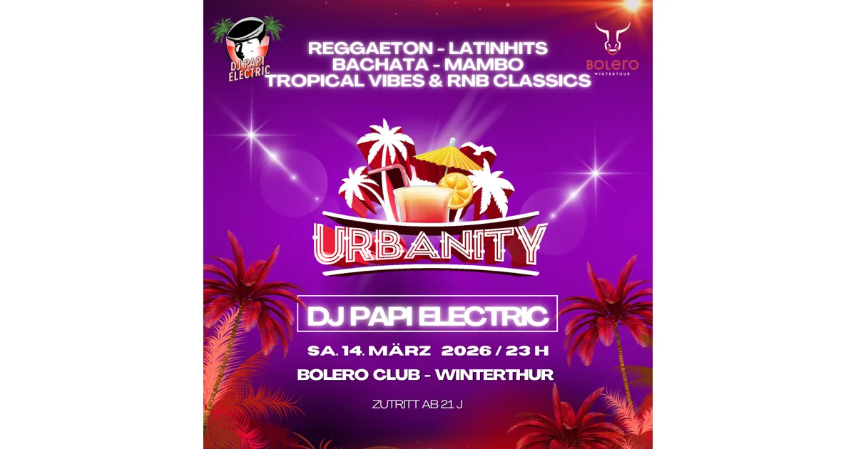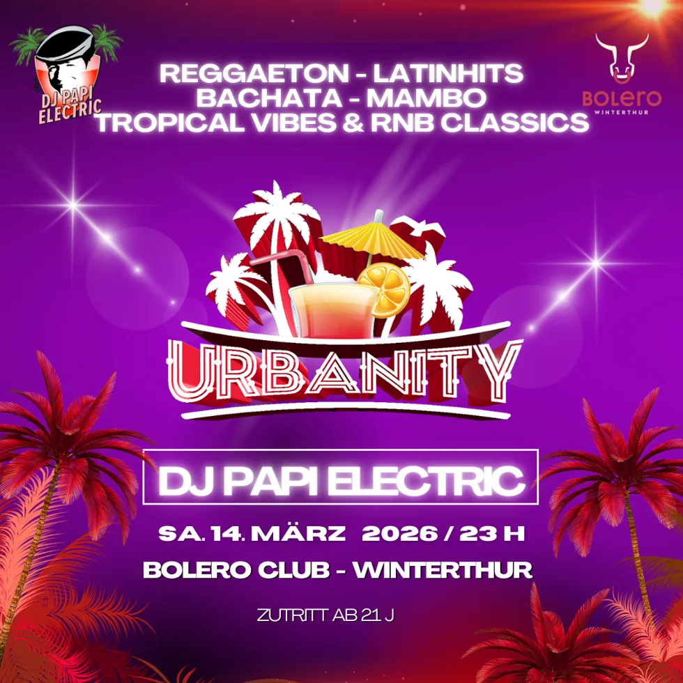 „Today’s Best Latin Music“ heißt es am 14. März 2026 ab 22:00 Uhr, wenn DJ Papi Electric im Bolero Club an der URBANITY die Tanzfläche zum Beben bringt.