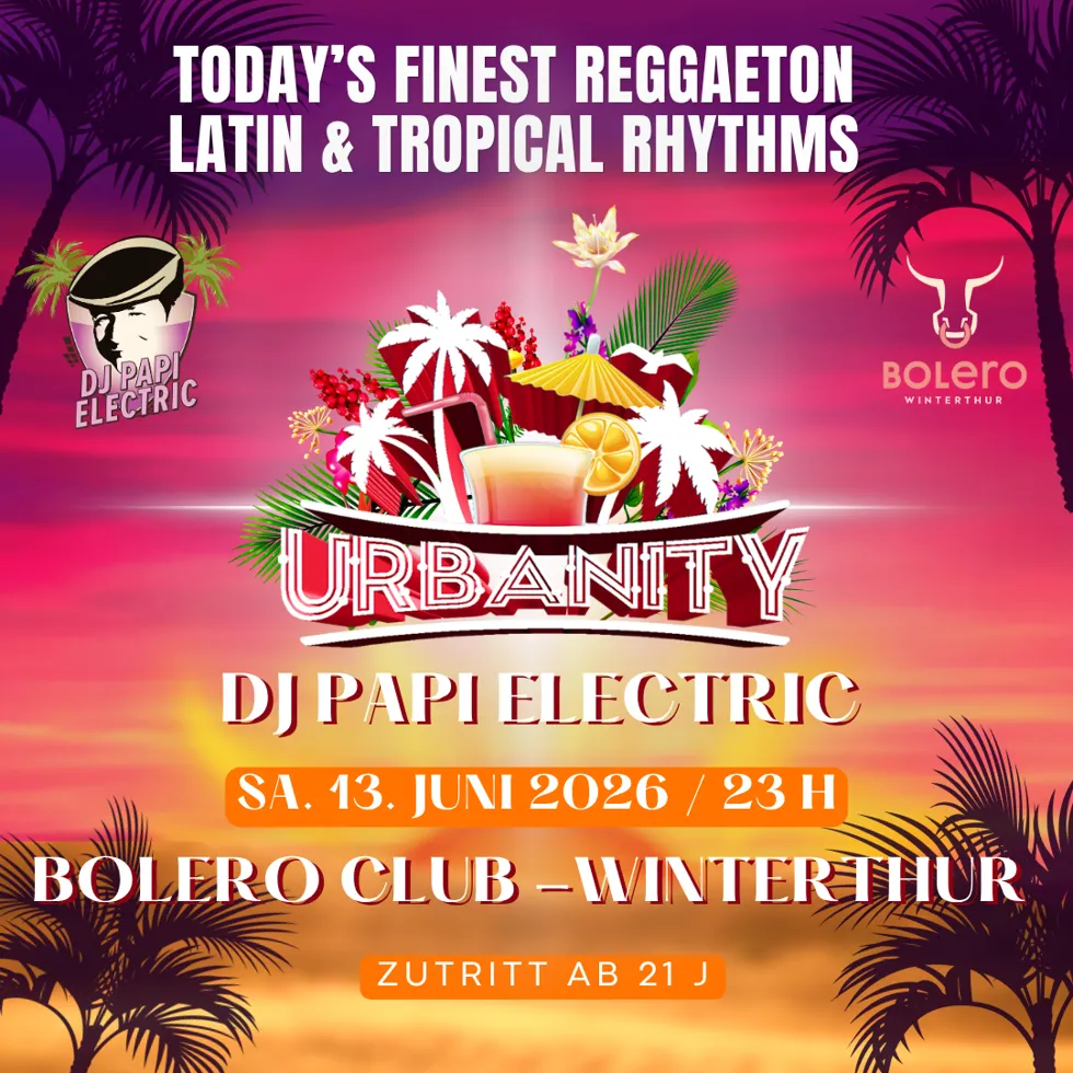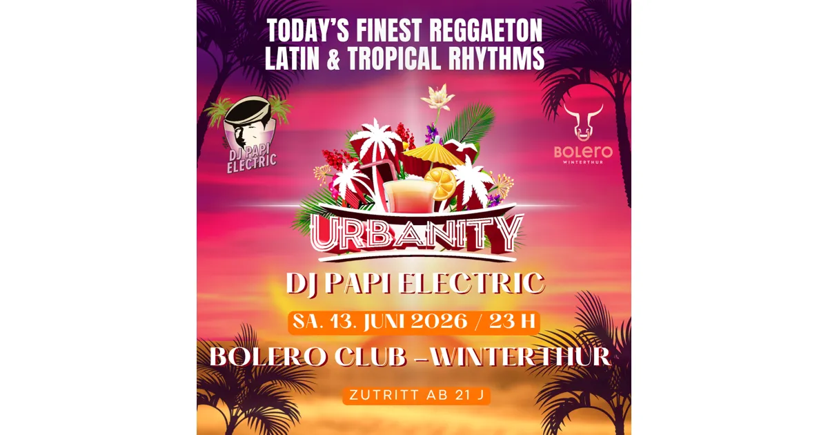 „Today’s Best Latin Music“ heißt es am 13. Juni 2026 ab 22:00 Uhr, wenn DJ Papi Electric im Bolero Club an der URBANITY die Tanzfläche zum Beben bringt.