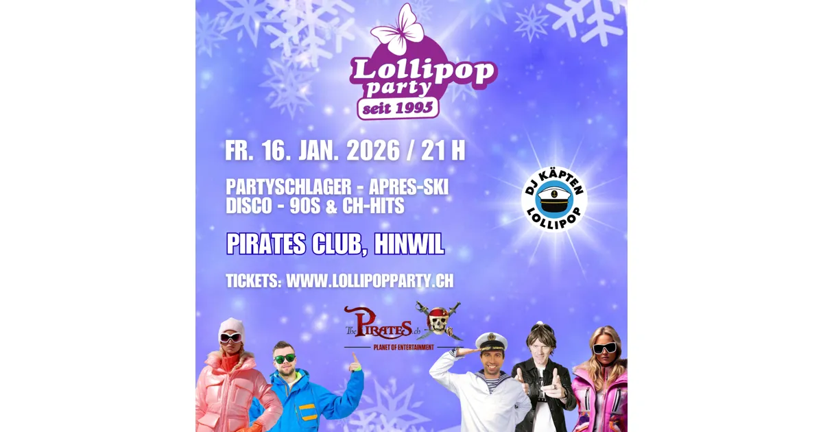 Schokolade macht glücklich - die Lollipop Party noch mehr! "Die süsseste Versuchung seit es Party gibt" läuft wieder in den Piraten Hafen in Hinwil ein. DJ Käpten Lollipop entert die Kajüte mit den besten Partyschlagern, Après-Ski-Hits, Disco & 90s-Klassikern – Leinen...