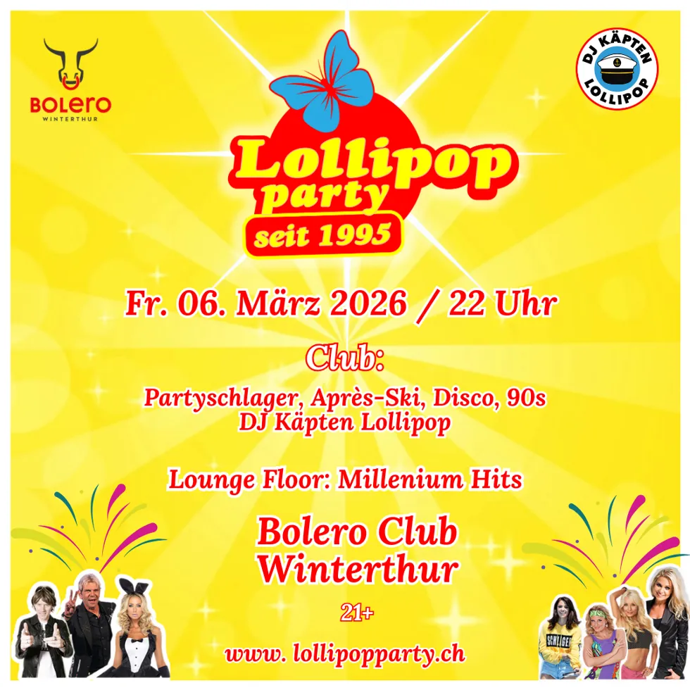 Die Lollipop Party im Bolero Club, Winterthur - Fr. 06. März 2026 ab 22 H - heisst Spass ohne Ende und viel Gute Laune. Auf die Ohren gibt's die grössten Partyschlager Hits aus vier Jahrzehnten, Après-Ski-Vibes, Disco Klassiker & 90er. DJ Käpten Lollipop versteht was...