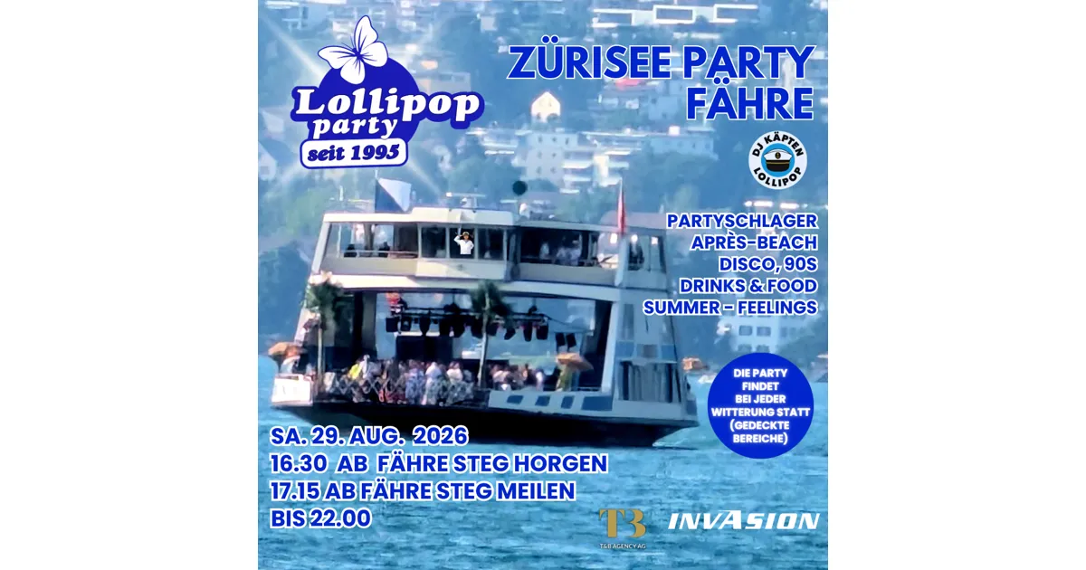 Lollipop Zürisee Party Fähre Vol. 2 - Horgen & Meilen - Sa. 19. Aug. 2026 ab 16.30 Uhr, 29. Aug. 2026, 16:30 mehr Informationen |